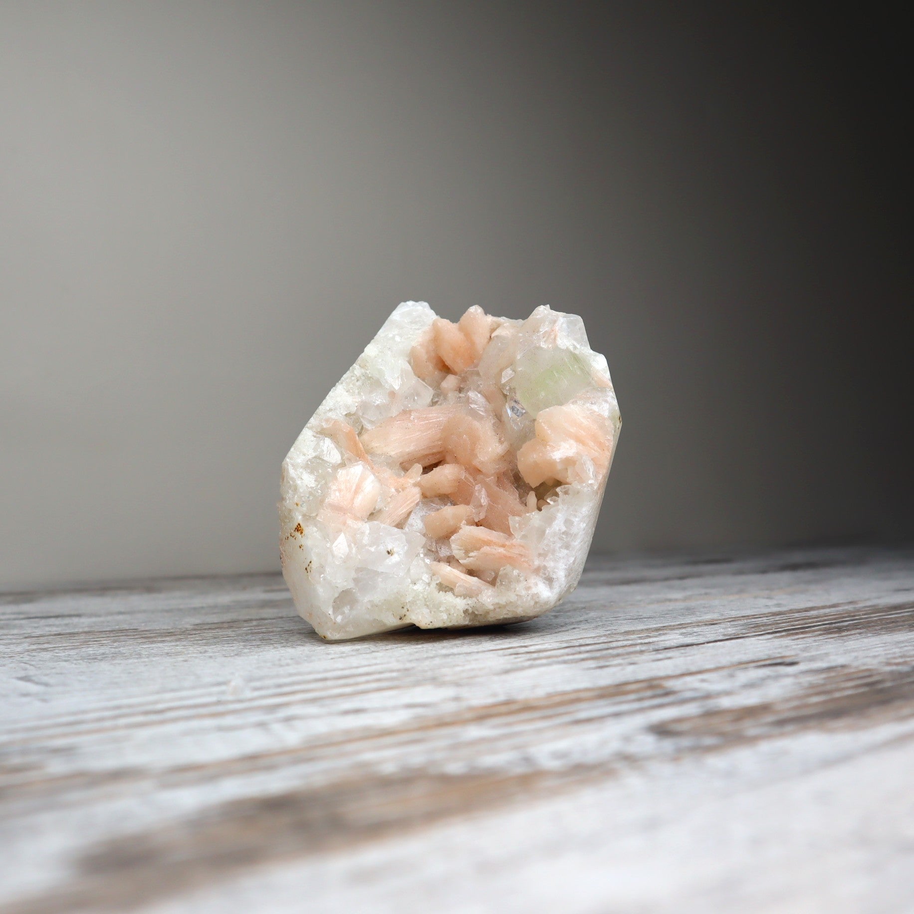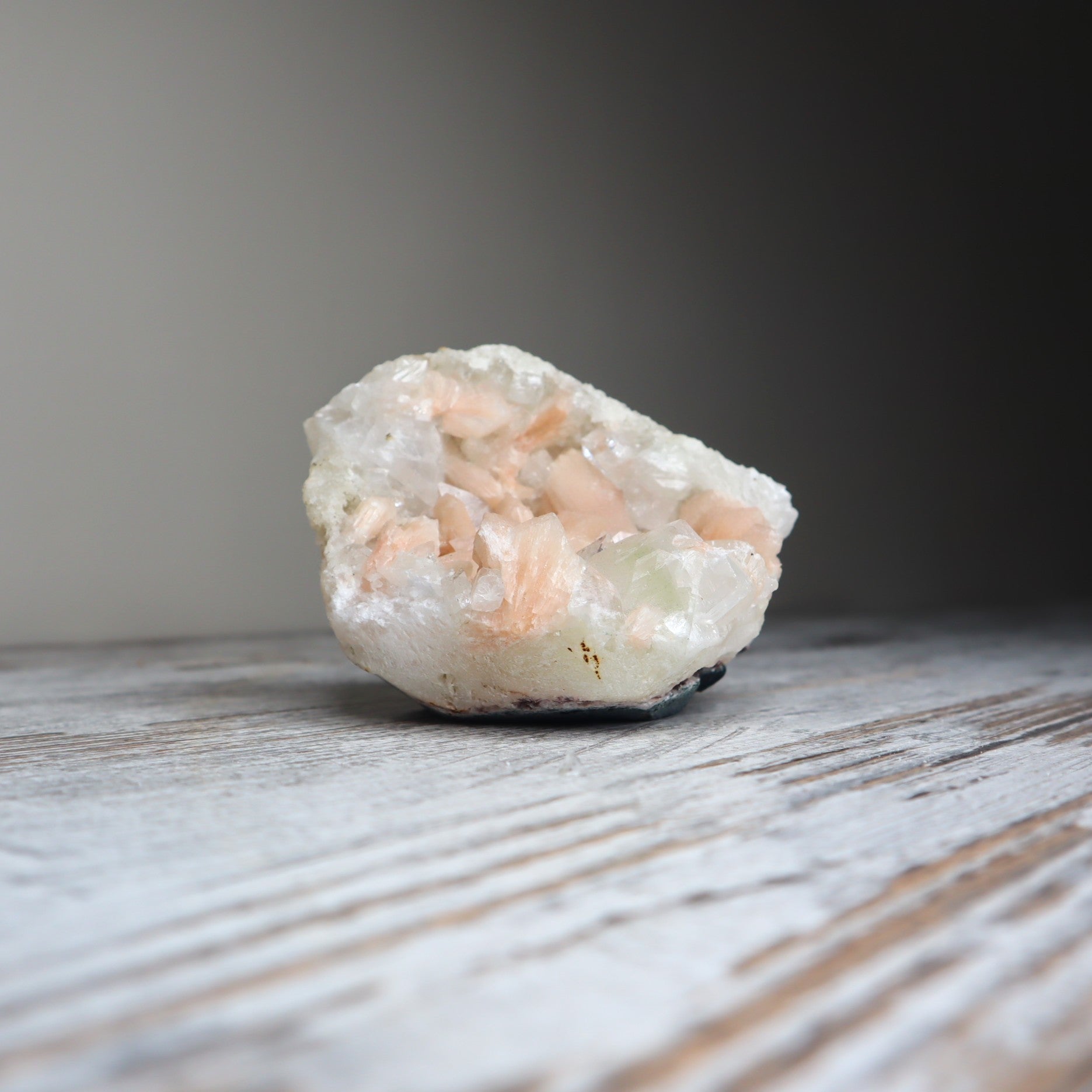 This one-of-a-kind Apophyllite Cluster showcases a dreamy fusion of peach-pink Stilbite blades nestled in a bed of shimmering clear Apophyllite crystals. Softly radiant and soul-soothing, this piece carries a serene, ethereal energy that feels like a gentle whisper from the cosmos. 🤍