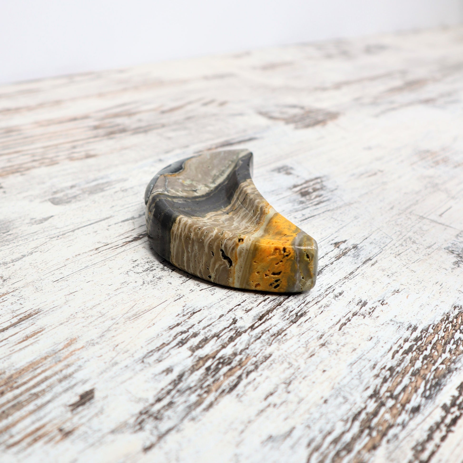 This striking Bumblebee Jasper Moon Bowl beams with strength and earthy beauty. Swirls of bold yellow, smokey charcoal, and volcanic grey ripple through its crescent shape like sunlight piercing through storm clouds. A stone of courage and empowered self-expression, this moon is here to remind you of your fire. 💛