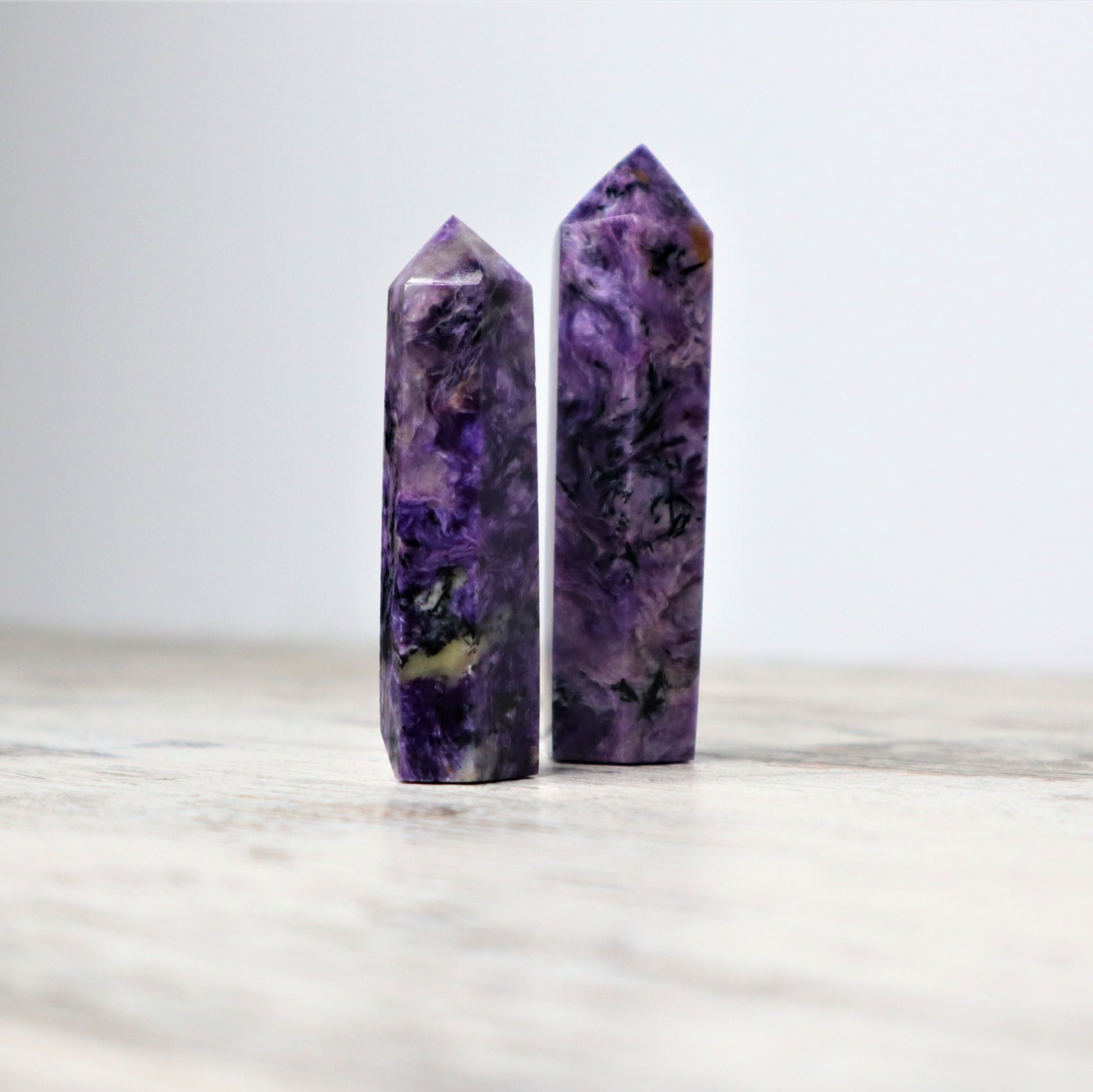 This elegant Charoite Tower dances with deep violets and marbled swirls—an energetic ally for those seeking alignment with their inner knowing. Its height and slender shape make it ideal for directing energy during ritual work or placing on your altar with intention. 💜