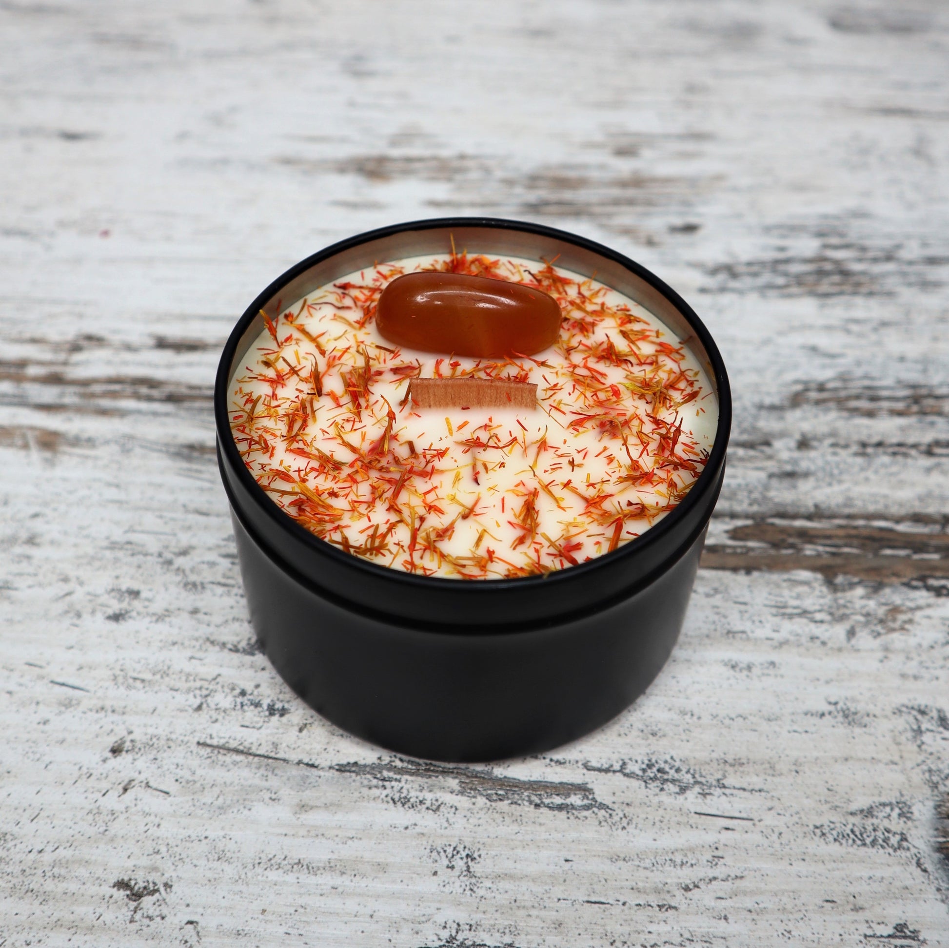 Infused with a bold blend of bergamot, ginger, orchid, heliotrope, patchouli, and musk, this radiant fragrance stirs imagination and motivation from within. Dried safflower petals add a splash of colour and warmth, while a hand-selected Carnelian tumble glows at the heart — a crystal known for boosting confidence, creativity, and bold expression.