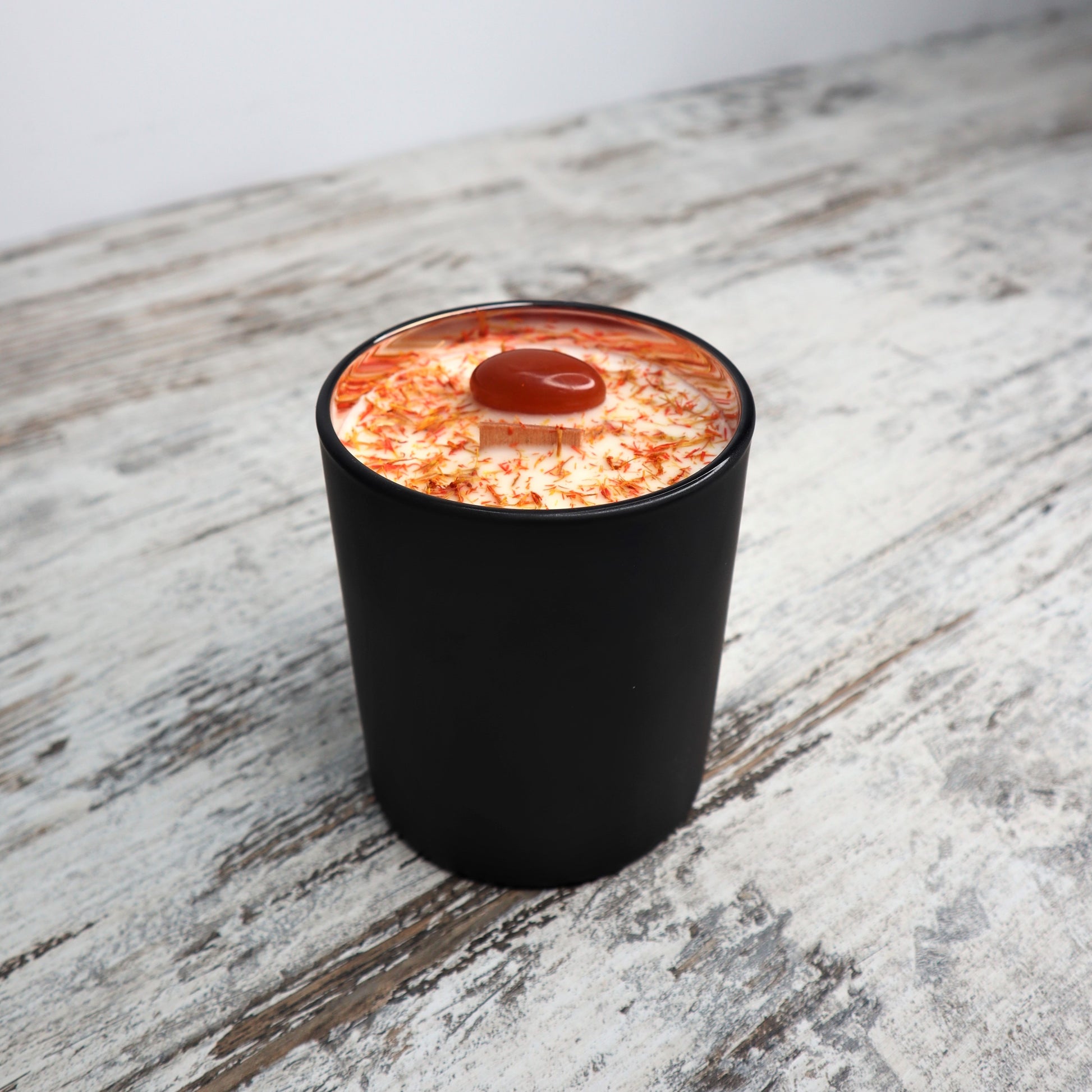 Poured into a striking matte black jar with a metallic rose gold interior, this candle is both visually mesmerising and energetically charged. The fragrance weaves together bergamot, ginger, orchid, heliotrope, patchouli, and musk — a vibrant blend that awakens the senses and encourages inspired action. Dried safflower petals and a radiant Carnelian tumble crown the wax, infusing each burn with empowering, creative energy.