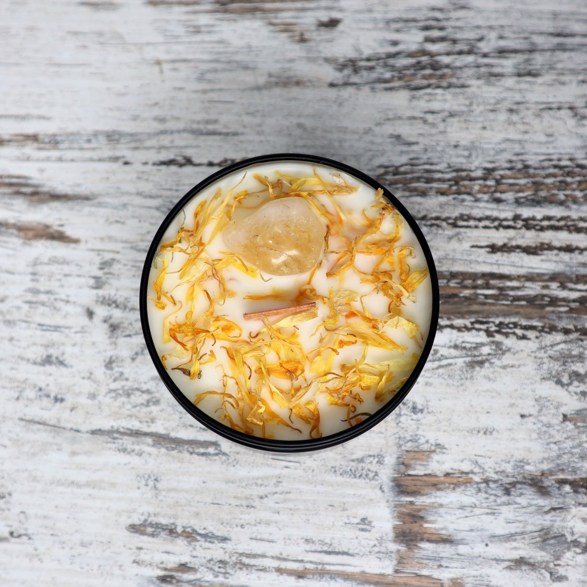 Infused with an inspiring blend of jasmine petals, coconut, musk, lemon, papaya, and melon, this scent dances between fruity sweetness and soft florals. Topped with dried calendula petals and a hand-selected Citrine tumble, it radiates clarity, confidence, and joy — encouraging bold action and abundant thinking.