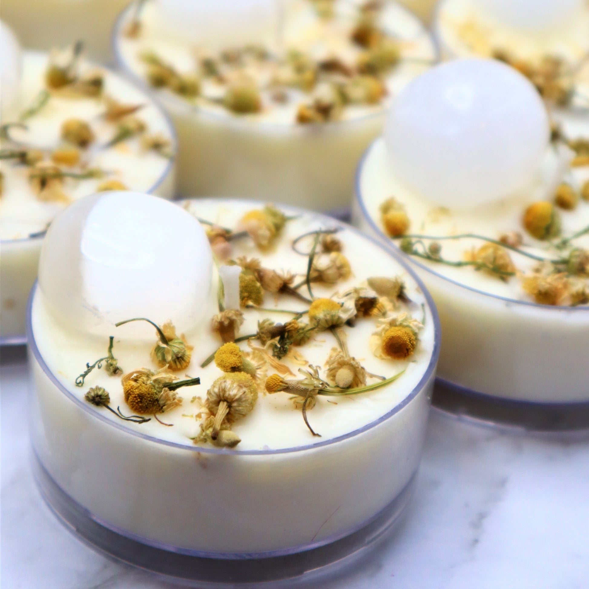 Infused with a fresh blend of pomegranate, lemon, lime, pineapple, and jasmine, this beautifully fragrant tealight creates a tranquil, soul-nourishing atmosphere. Adorned with organic chamomile flowers and a mini Selenite tumble, it’s ideal for meditation, energy cleansing, or connecting to your intuition.