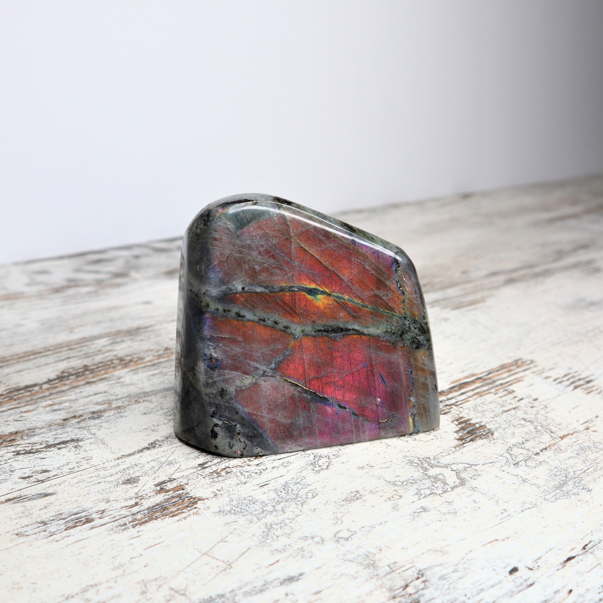 Labradorite is a stone of transformation and mystic insight — and this 680g beauty, standing approx. 9cm tall, showcases a beautiful orange-pink flash that feels soft, feminine, and full of soul. It's a radiant piece that blends divine protection with creative activation, ideal for those walking a spiritual path or seeking higher guidance.