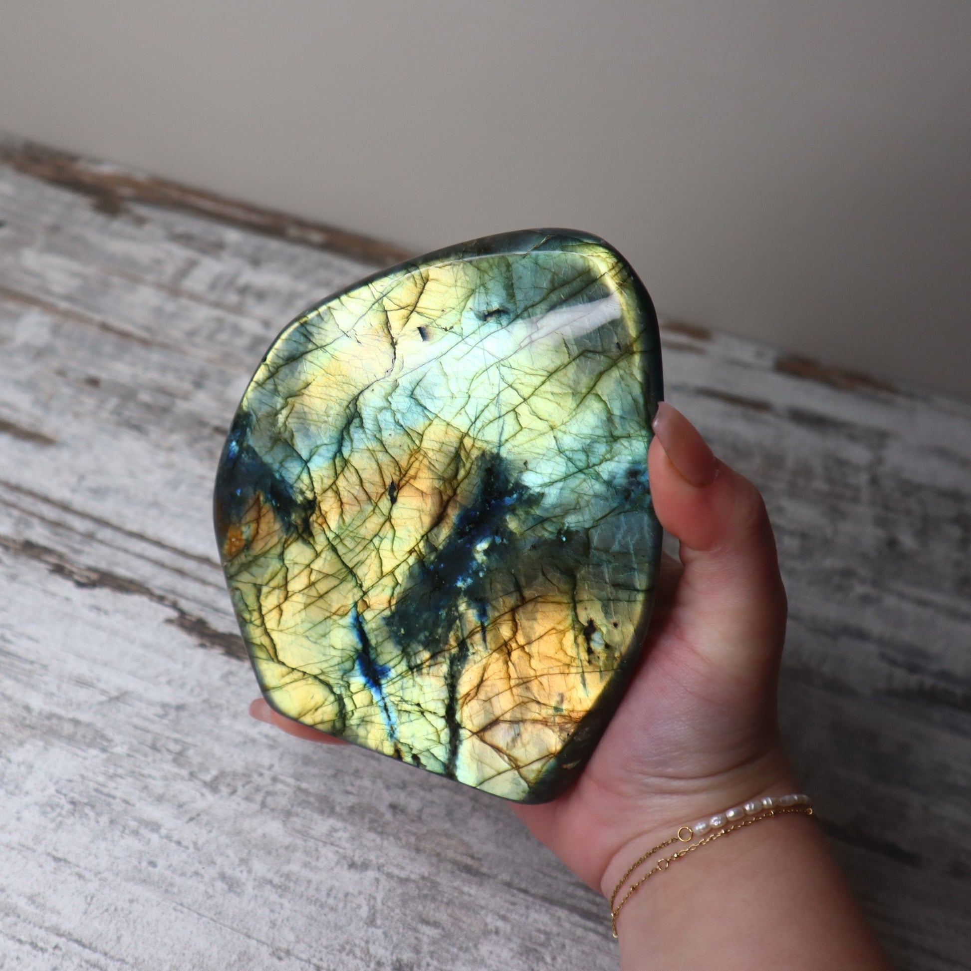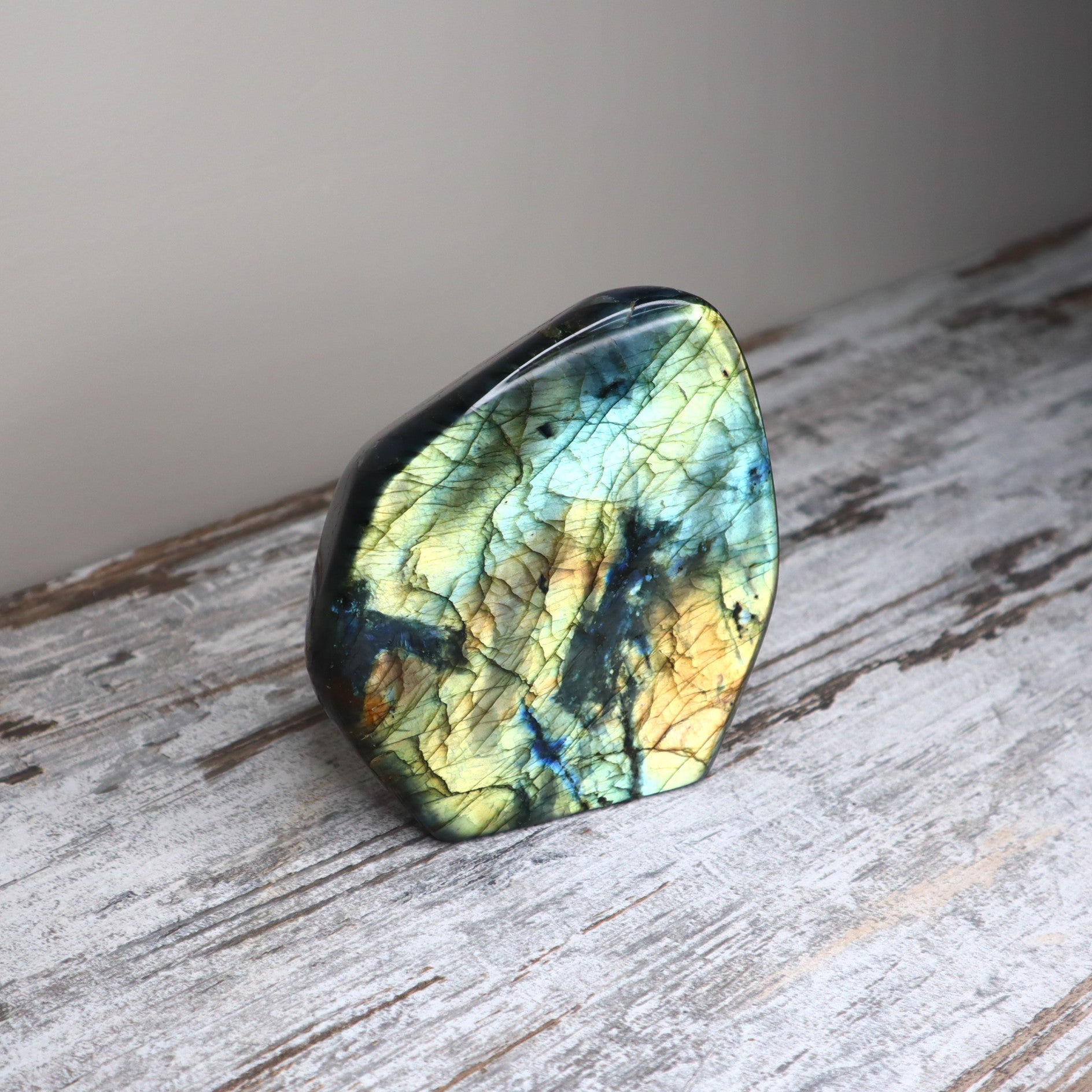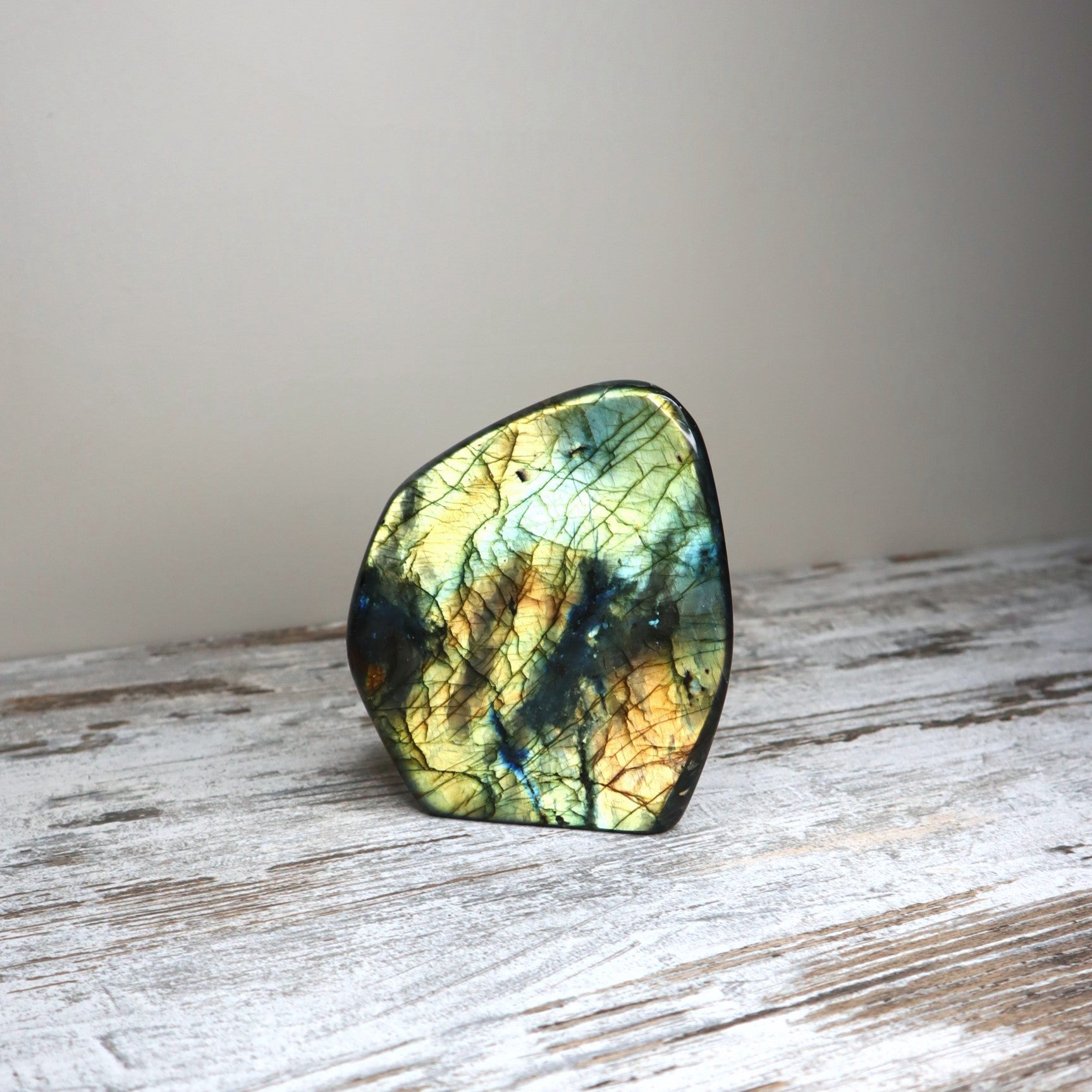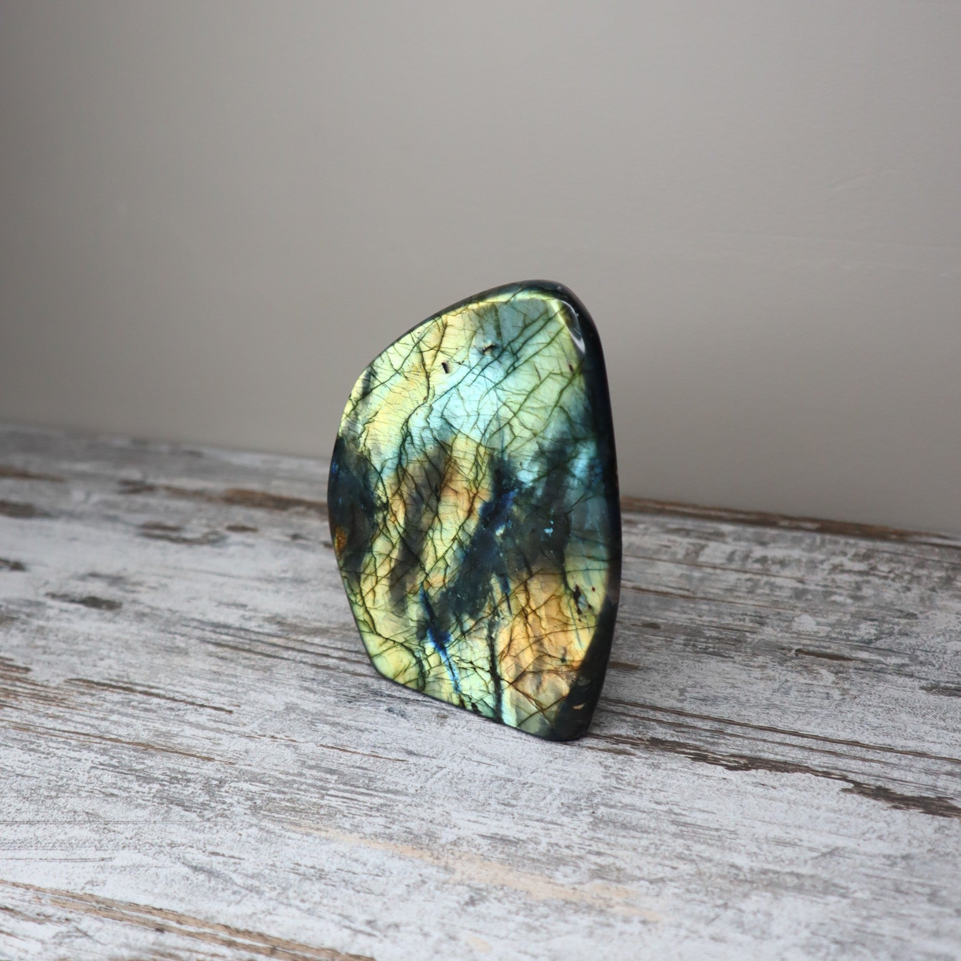 Labradorite Freeform – approx. 1.2kg / 14cm – radiant green-gold flash with polished finish; perfect for spiritual seekers and sacred spaces