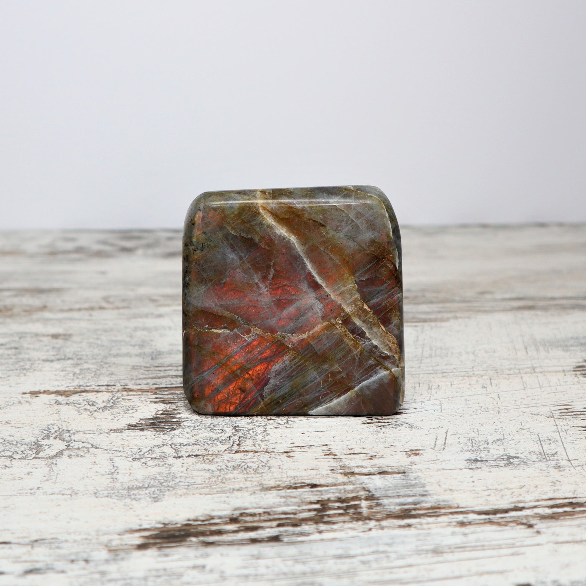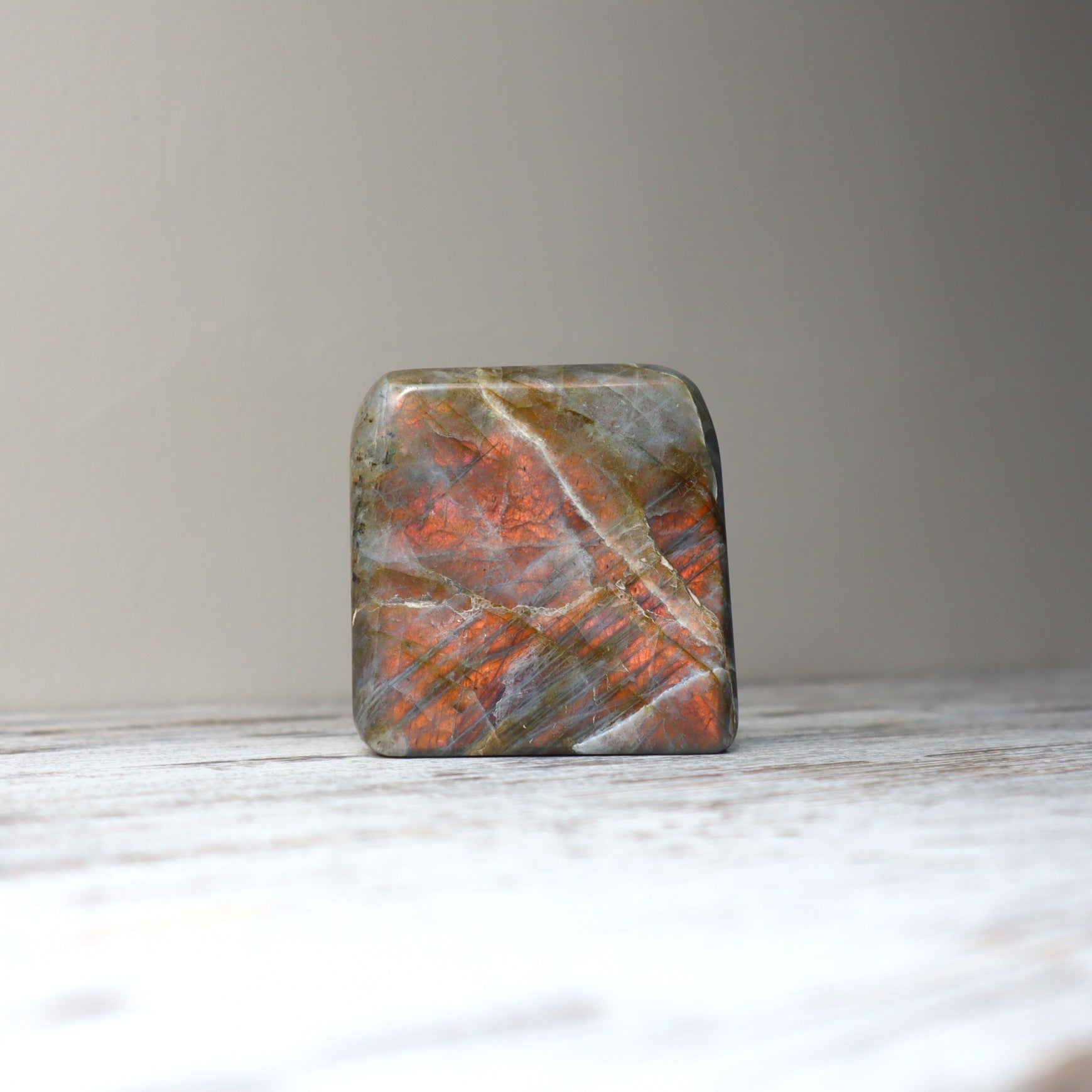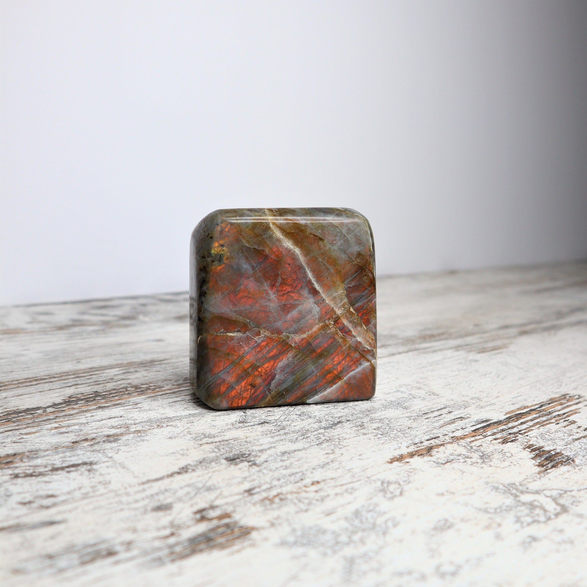Known as the Stone of Magic, Labradorite helps you awaken inner vision, trust your instincts, and stay energetically shielded from external noise. This 468g beauty stands approx. 7.5cm tall and flashes with rich, coppery-orange tones — a rare find that brings solar warmth to this otherwise mysterious stone.