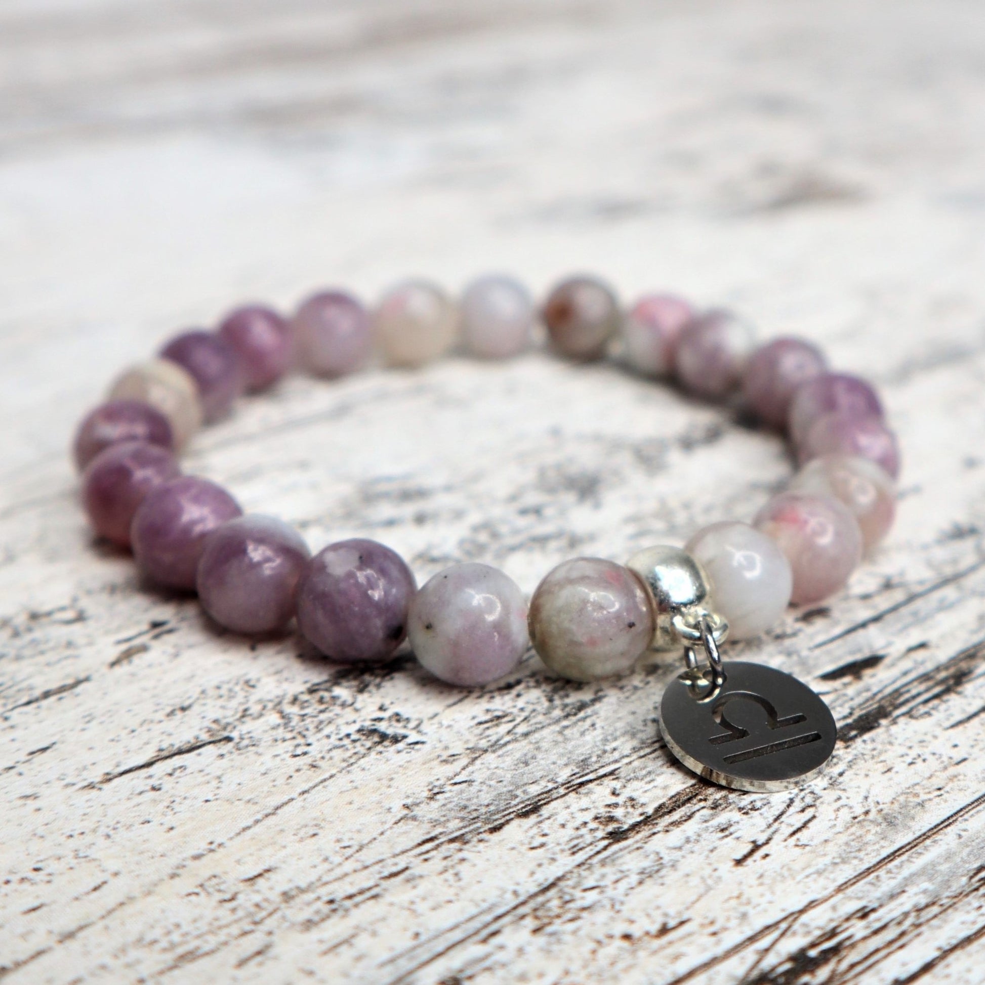 Our beautiful Libra Bracelet is lovingly made with 8mm Pink Tourmaline Beads on strong elastic cord and finished with a 12mm Stainless Steel Zodiac Charm.