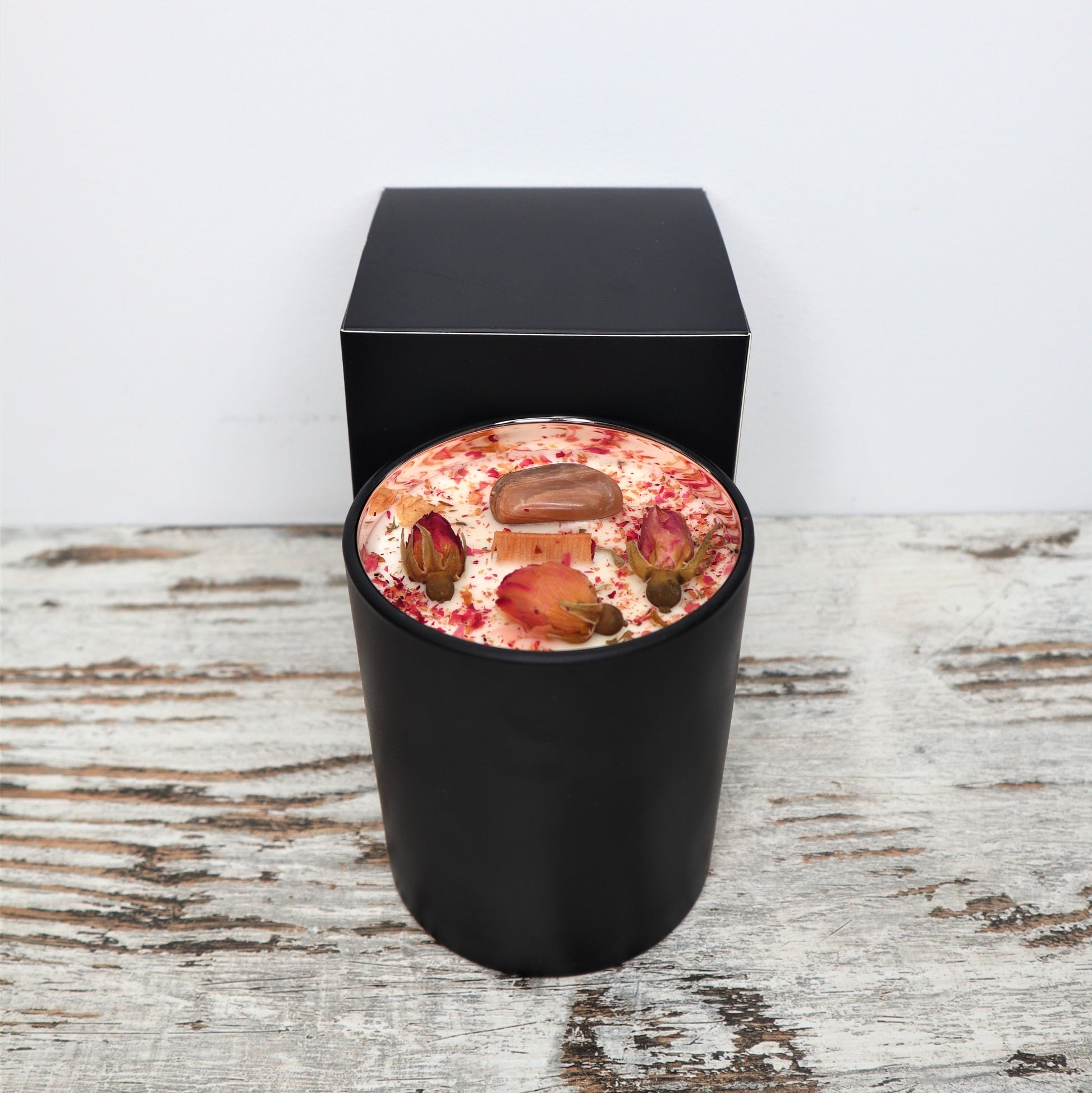Housed in a sleek matte black jar with a metallic rose gold interior, this elegant candle radiates warmth and intention. Its alluring scent weaves together notes of Peach, Strawberry, Lemon, Vanilla, and Musk, creating an atmosphere of sweet serenity and inspiration. Adorned with dried Rose Buds and a luminous Peach Moonstone tumble, this candle is a powerful ally for emotional renewal, confidence, and soft, empowering transformation.