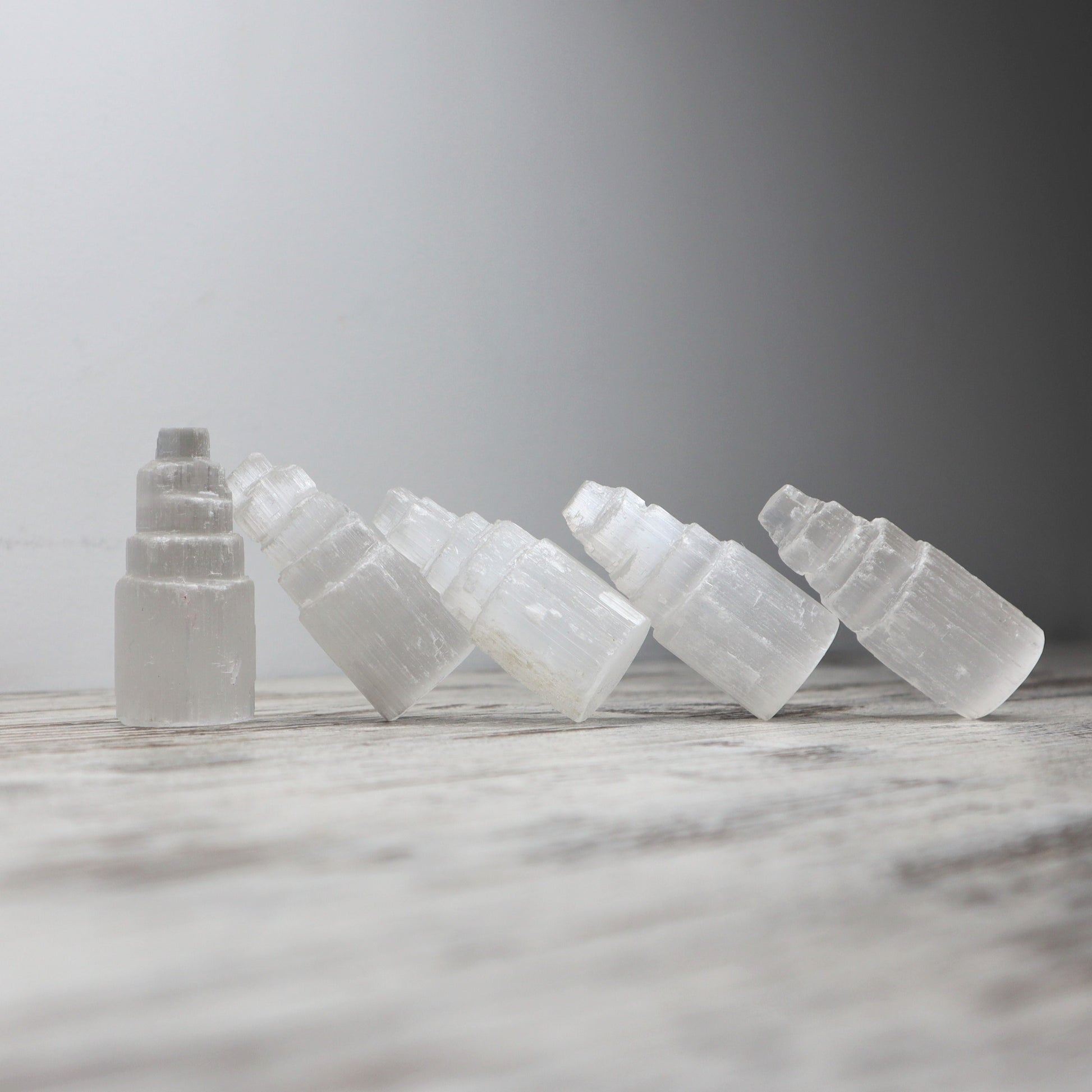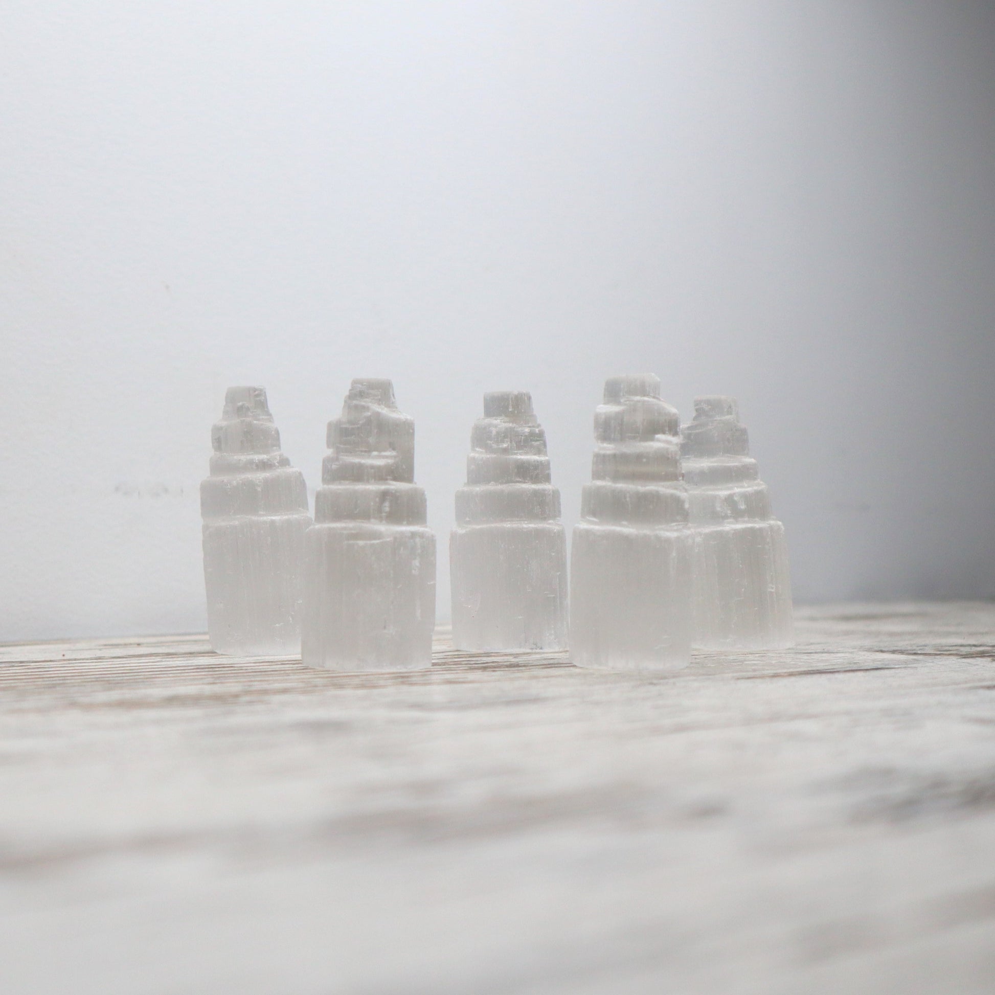 These luminous Selenite Towers radiate pure, high-frequency energy—like holding moonlight in your hands. Their raw texture and stepped form resemble ancient crystalline spires, making them a powerful and beautiful tool for cleansing energy and elevating any sacred space. 🤍