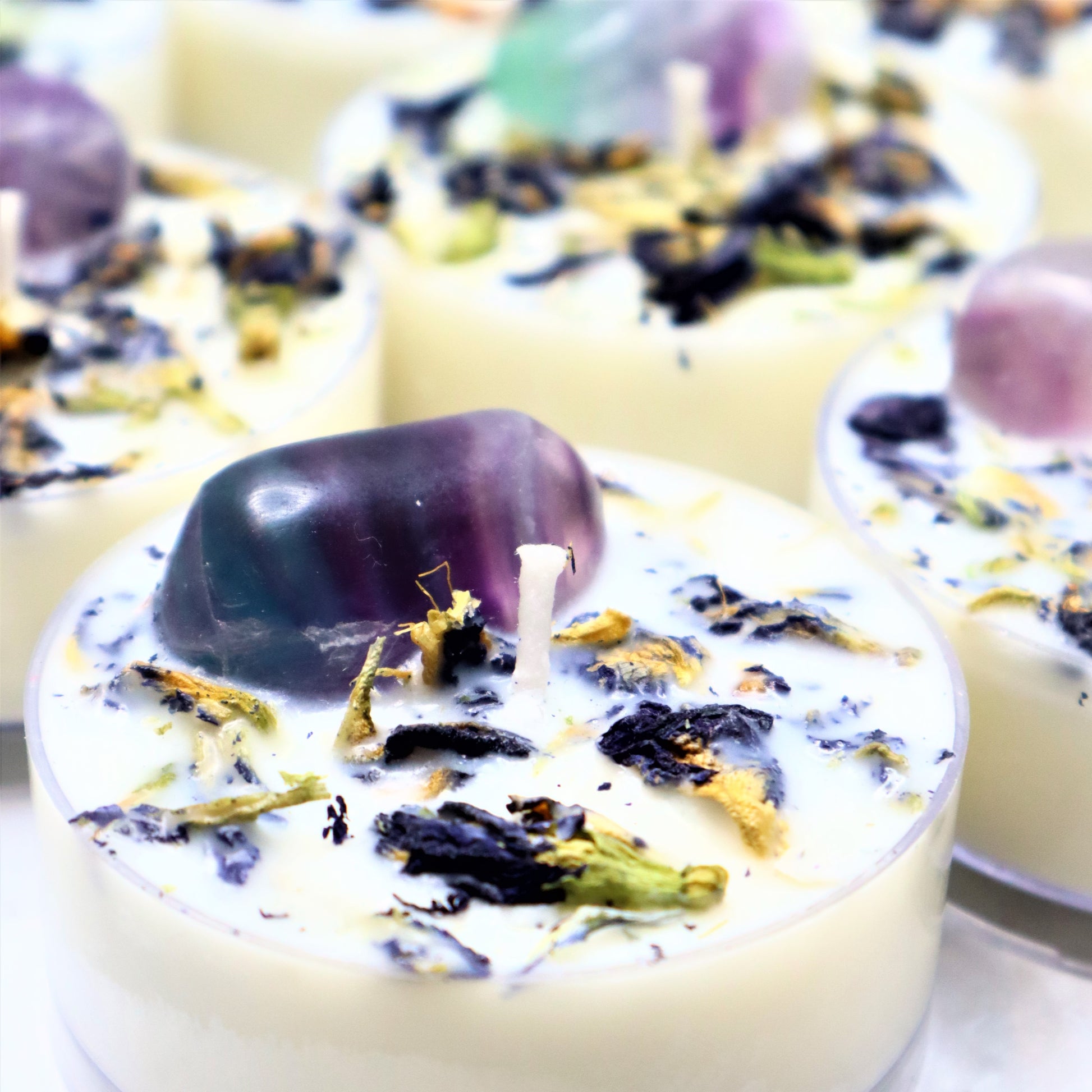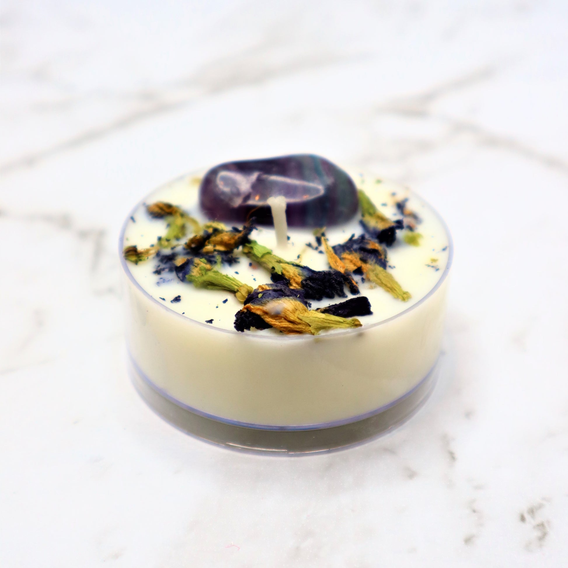 This mentally refreshing blend combines honeydew, sweet pea, peach nectar, redcurrant, and jasmine to create a scent that’s both uplifting and soothing. Topped with blue butterfly pea flower and a mini Fluorite tumble, this tealight is the perfect companion for study sessions, creative work, or moments when you need a clear head.