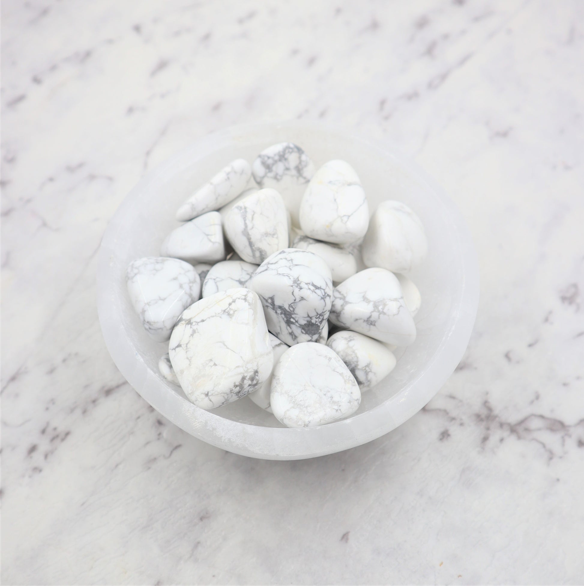 Howlite is a calming stone that soothes & relaxes the mind and opens us to higher spiritual consciousness, which makes it a wonderful meditation companion. It is a beautiful stone to use when needing to alleviate stress, tension and anxiety as it teaches patience, calms communication, facilitates awareness and encourages expression. Howlite will calm and soothe emotions, slow an overactive mind and helps achieve a deep, restful sleep. On a physical level, Howlite promotes relaxation, releases muscular tensions and aids in calcium absorption.