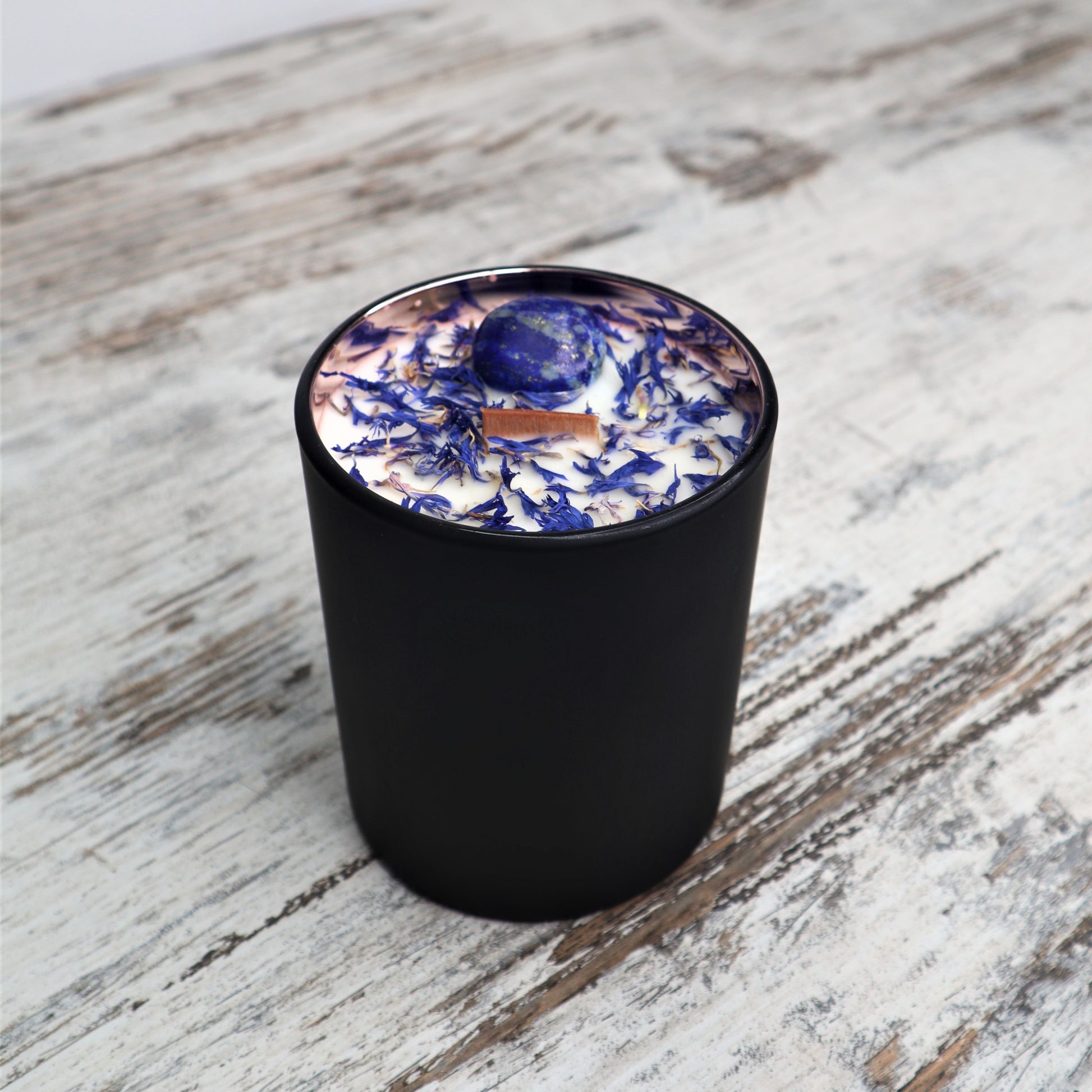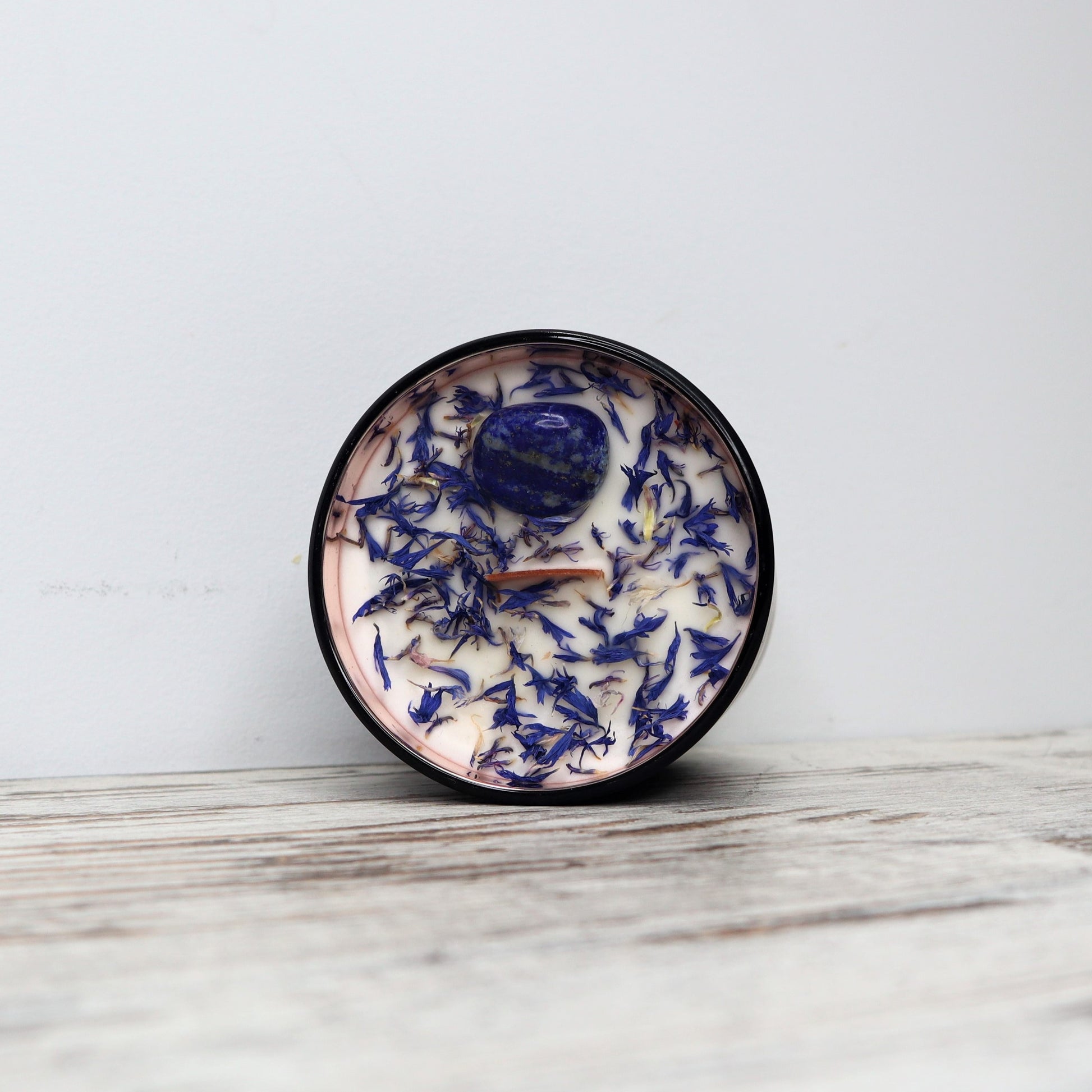 Infused with an uplifting blend of sage, juicy blackberries, and zesty orange peel, this mystical fragrance clears mental fog and inspires clear self-expression. Topped with dried cornflower petals and a Lapis Lazuli tumble, this candle opens the gateway to higher wisdom, courage, and authentic voice.